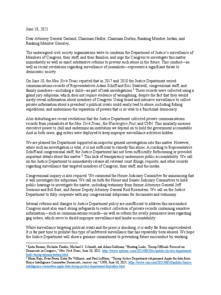 The undersigned civil society organizations write to condemn the Department of Justice’s surveillance of