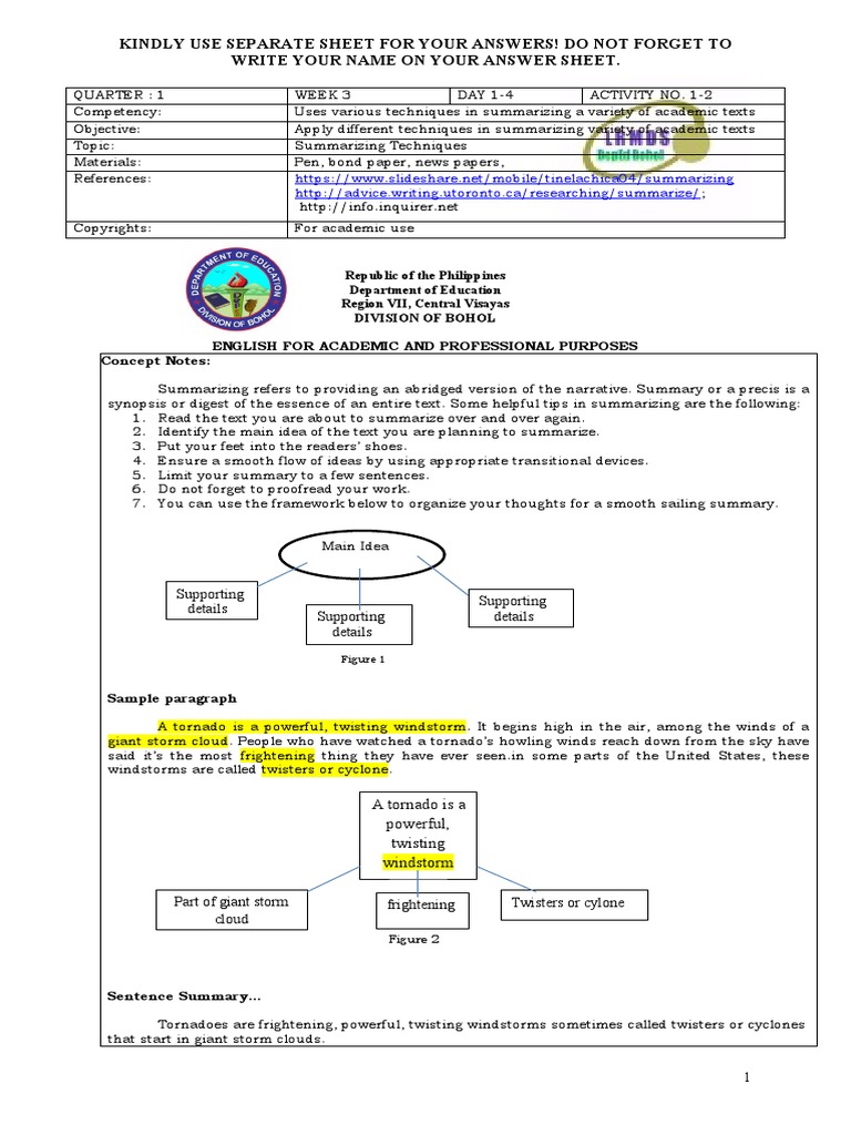 Objective: Apply different techniques in summarizing variety of academic texts