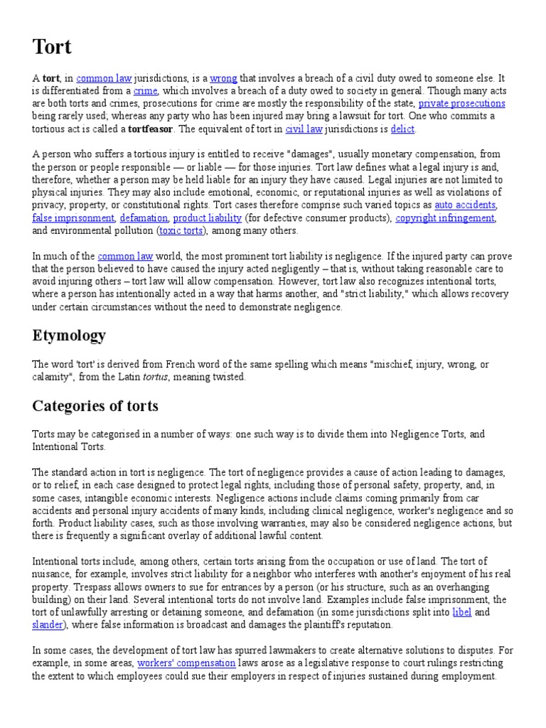 the person). A tort allows a person, usually the victim, to obtain a remedy that serves their own purposes (for