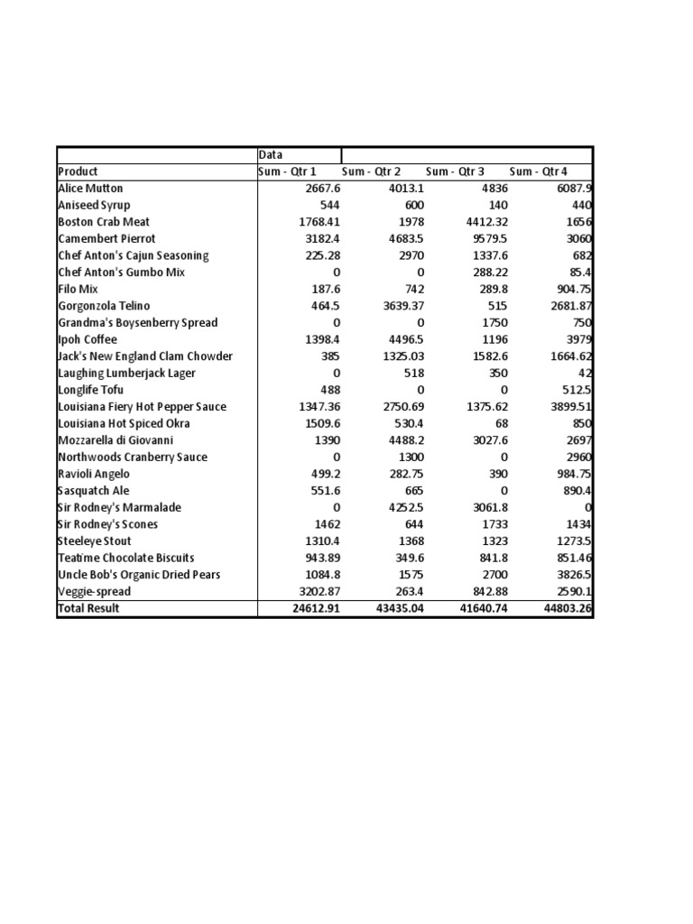 Product Sum - Qtr 1 Sum - Qtr 2 Sum - Qtr 3 Sum - Qtr 4