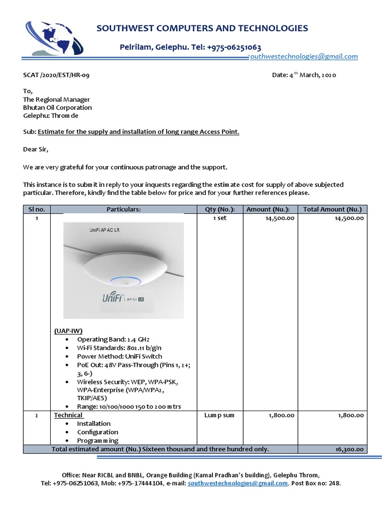 Tel: +975-06251063, Mob: +975-17444104, e-mail: southwestechnologies@gmail.com. Post Box no: 248.