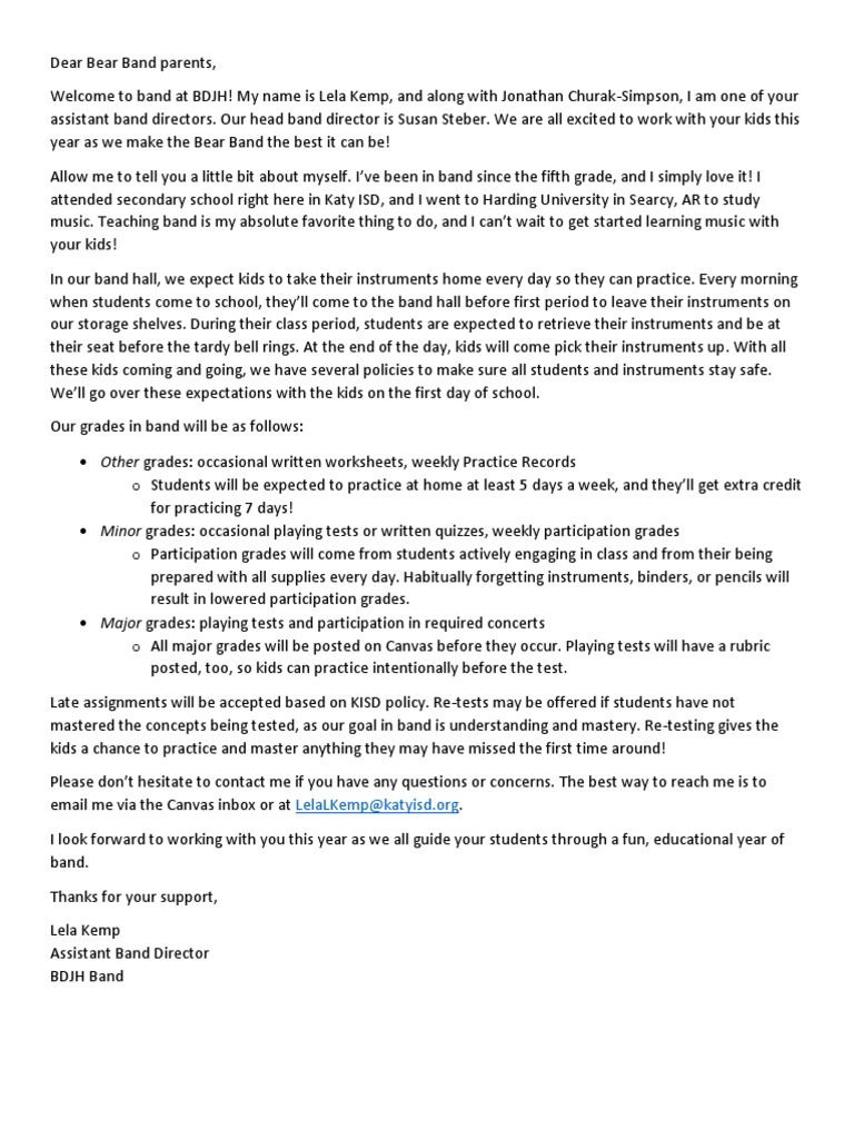Welcome to band at BDJH! My name is Lela Kemp, and along with Jonathan Churak-Simpson, I am one of your