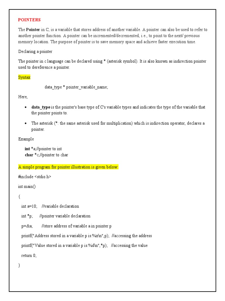memory location. The purpose of pointer is to save memory space and achieve faster execution time.