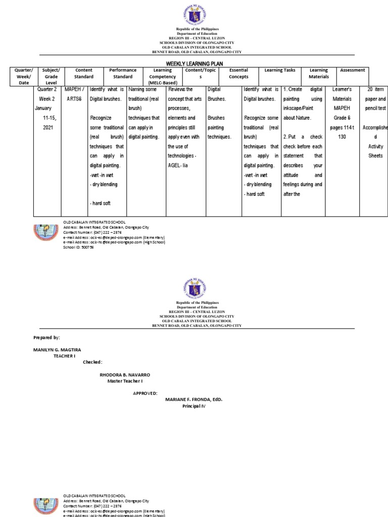Quarter/ Subject/ Content Performance Learning Content/Topic Essential Learning Tasks Learning Assessment