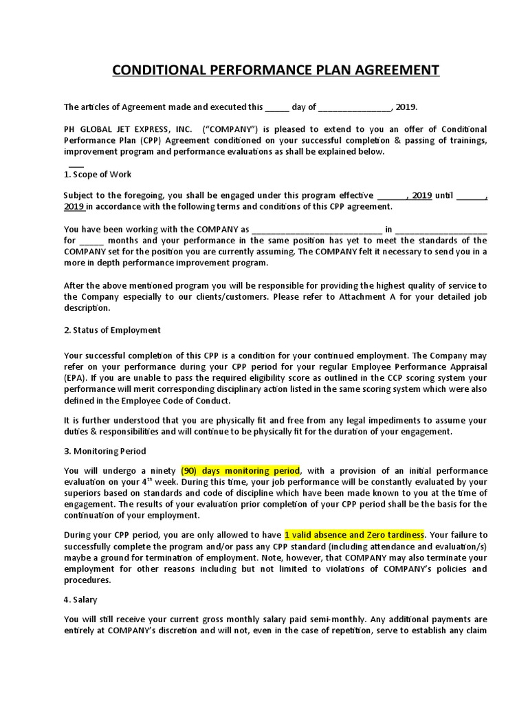 Performance Plan (CPP) Agreement conditioned on your successful completion & passing of trainings,