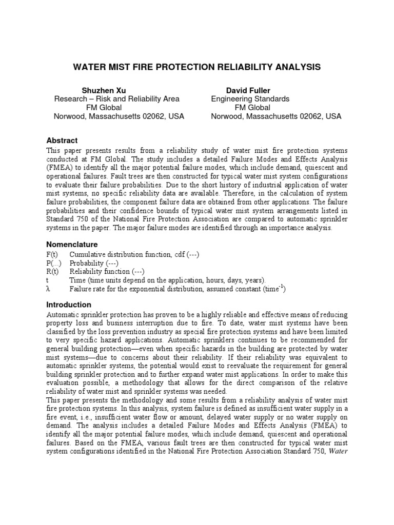 The reliability of water mist systems is assessed by using FMEA and FTA techniques and