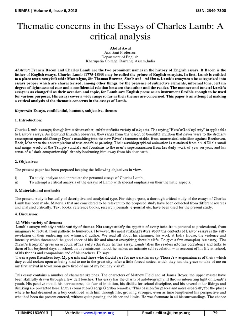 ii) To attempt a critical analysis of the essays of Lamb with special emphasis on their thematic aspects.