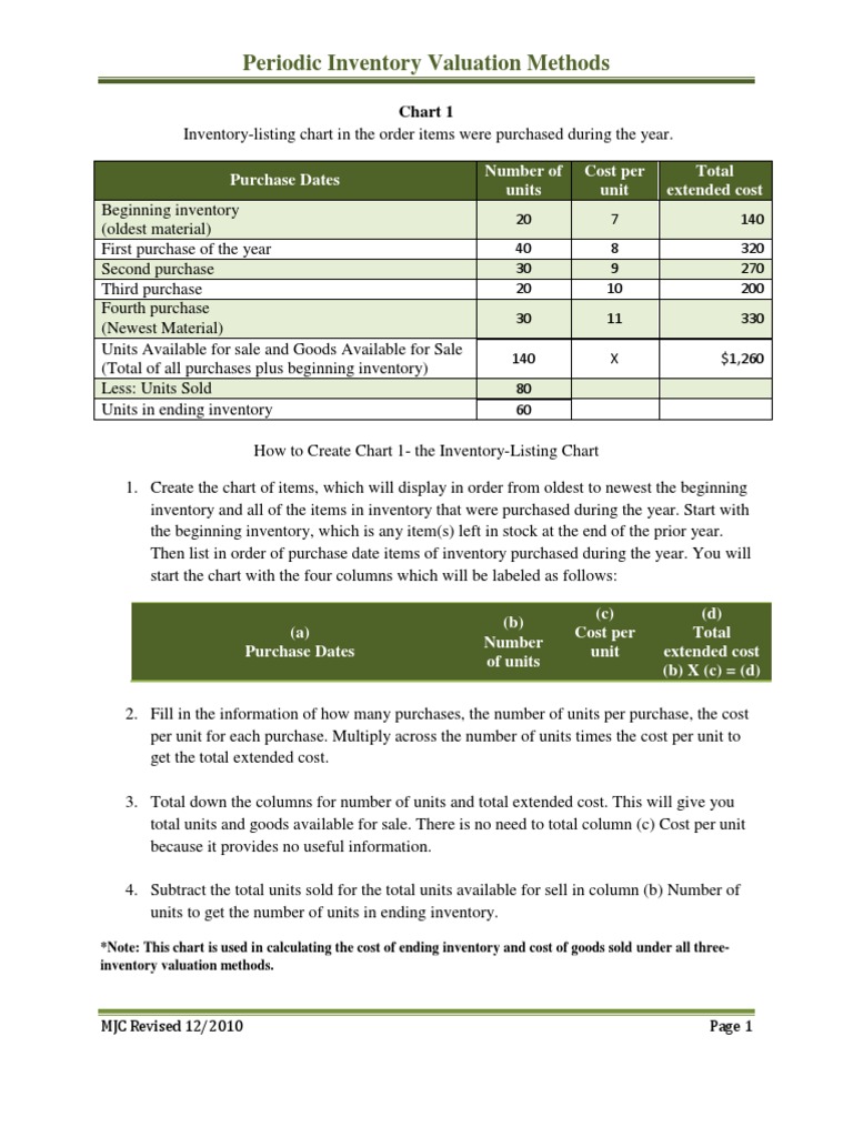 How to Create Chart 1- the Inventory-Listing Chart 1. Create the chart of items, which will display in order from oldest to newest the beginning inventory and all of the items in inventory that were purchased during the year. Start with the beginning inventory, which is any item(s) left in stock at the end of the prior year. Then list in order of purchase date items of inventory purchased during the year. You will start the chart with the four columns which will be labeled as follows: (b) Number of units (c) Cost per unit (d) Total extended cost (b) X (c) = (d)