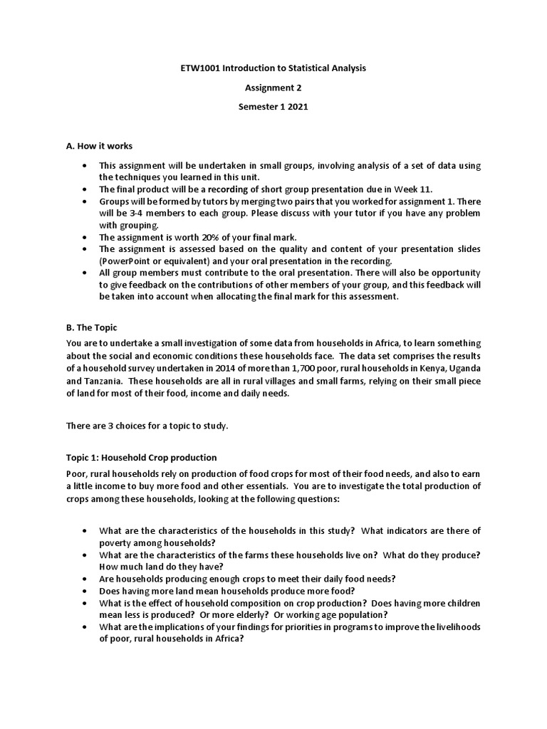 • This assignment will be undertaken in small groups, involving analysis of a set of data using
