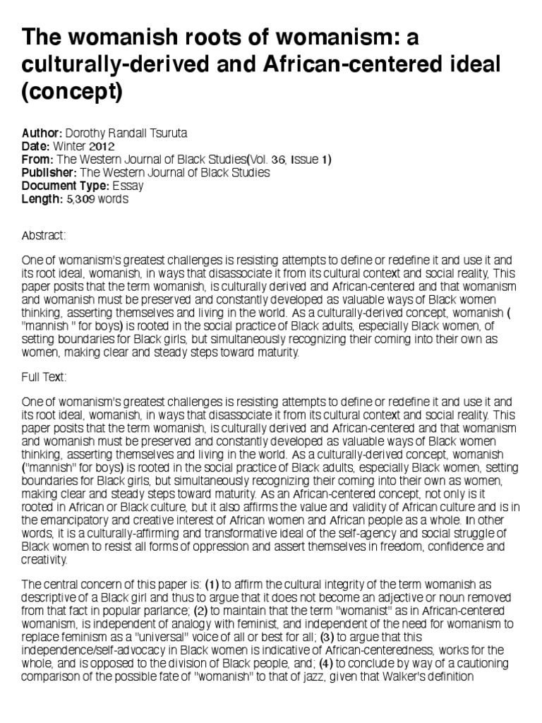 The Womanish Roots of Womanism: A Culturally-Derived and African-Centered Ideal (Concept)