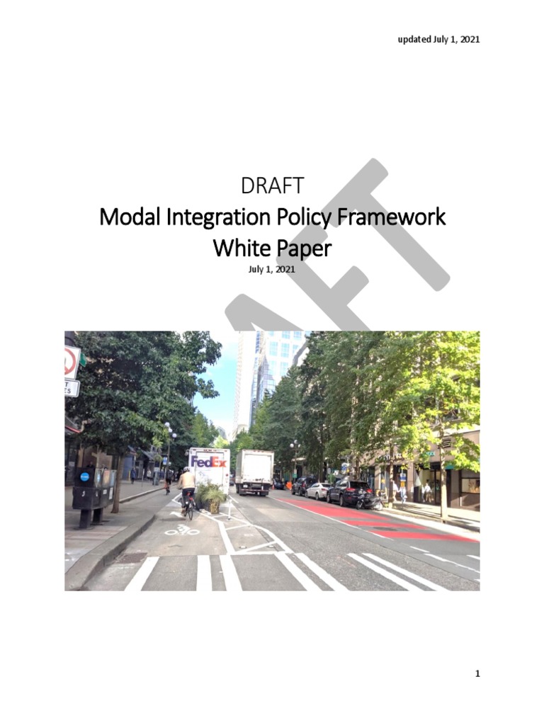 is to develop policy guidance and identify next steps for how to best integrate our modal master plan networks (Transit Master Plan, Pedestrian Master Plan, Freight Master Plan, and Bicycle Master Plan) to better address competing needs for people walking and biking, people riding transit, freight vehicles, personal vehicles, and critical access needs. Our policy focus is on locations where street rights-of-way are too narrow to accommodate essential street functions, particularly our priority modal networks. Our desired outcomes