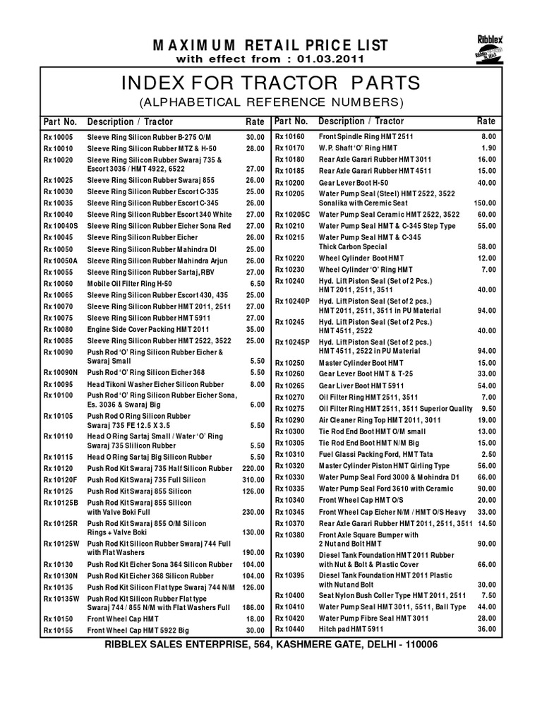 Rx 19655 Steering Kit Kartar Combine 72.00 Rx 19910 Air Cleaner Ring Sonalika 3 Cyl 24.00