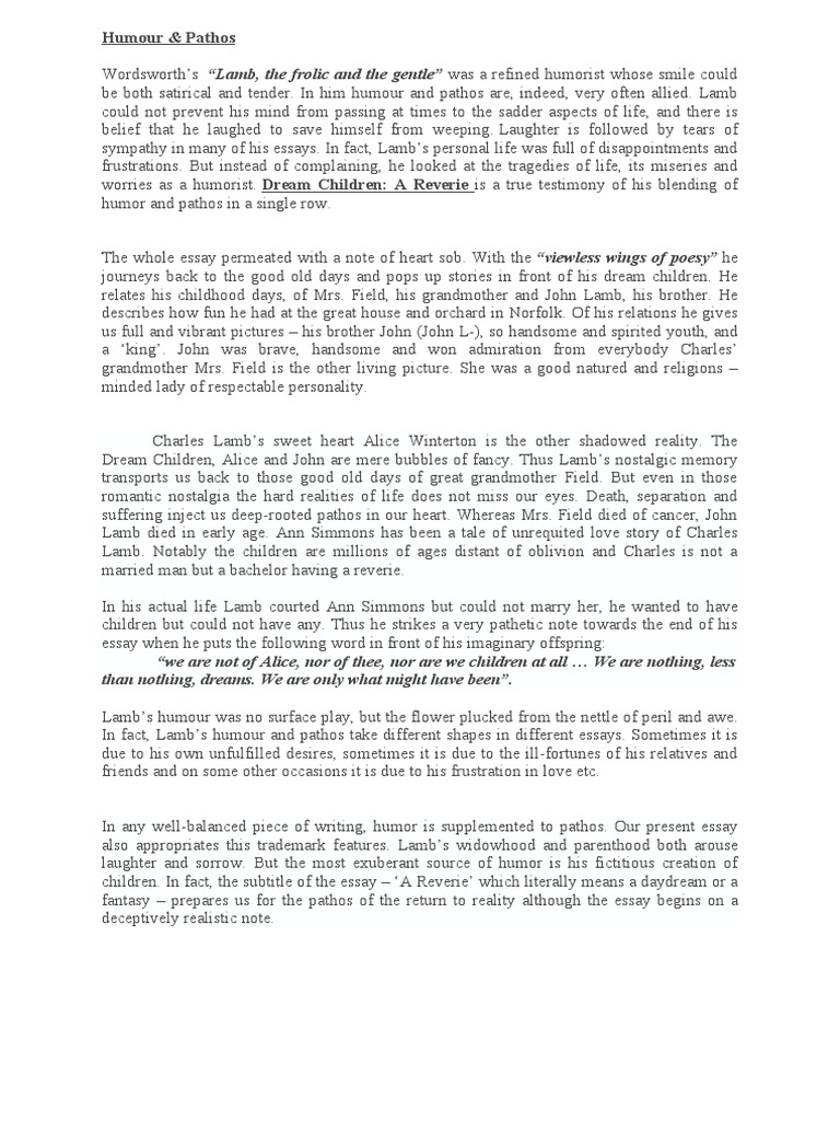 In fact, Lamb’s humour and pathos take different shapes in different essays. Sometimes it is