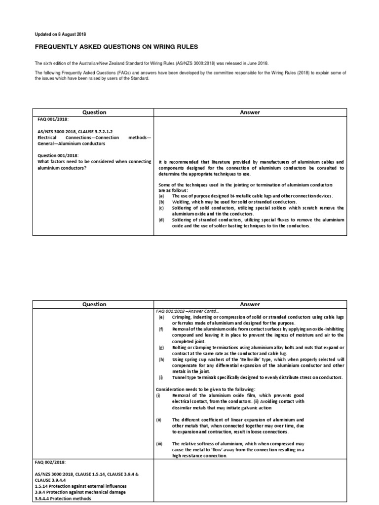 The following Frequently Asked Questions (FAQs) and answers have been developed by the committee responsible for the Wiring Rules (2018) to explain some of