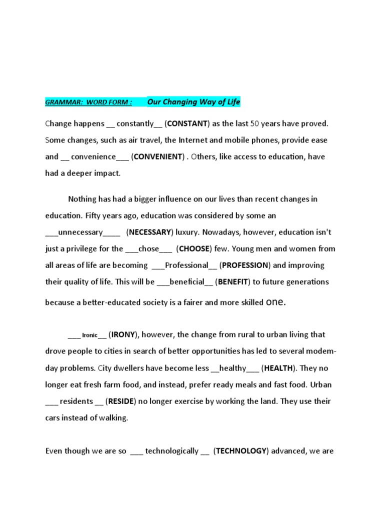 GRAMMAR: WORD FORM : Our Changing Way of Life