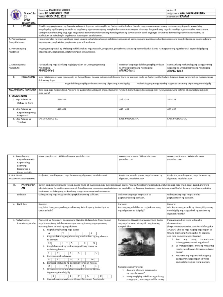 Grade 1 To 12 Daily Lesson Log I. Layunin: A. Sanggunian