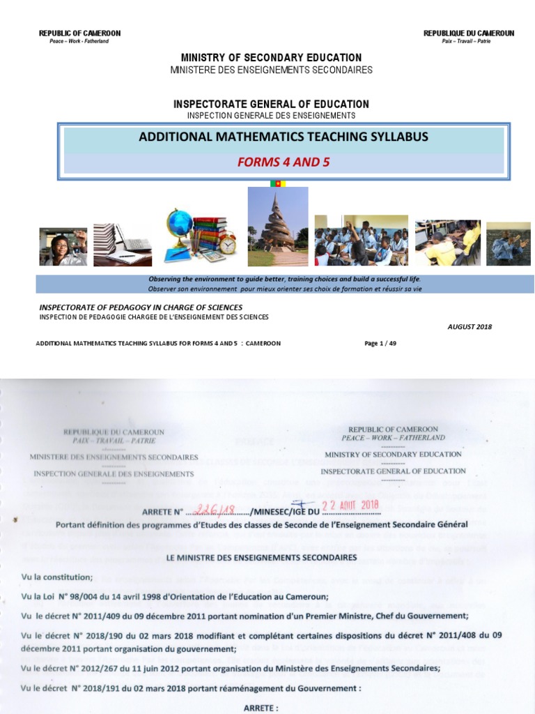 ADDITIONAL MATHEMATICS TEACHING SYLLABUS FOR FORMS 4 AND 5 : CAMEROON Page 1 / 49