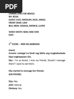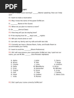 The document is a hotel reservation script between a receptionist and a client. The receptionist greets the client and asks for their name and dates of travel to provide room availability and pricing options. The client requests a room for two people for three nights and the receptionist confirms the reservation.