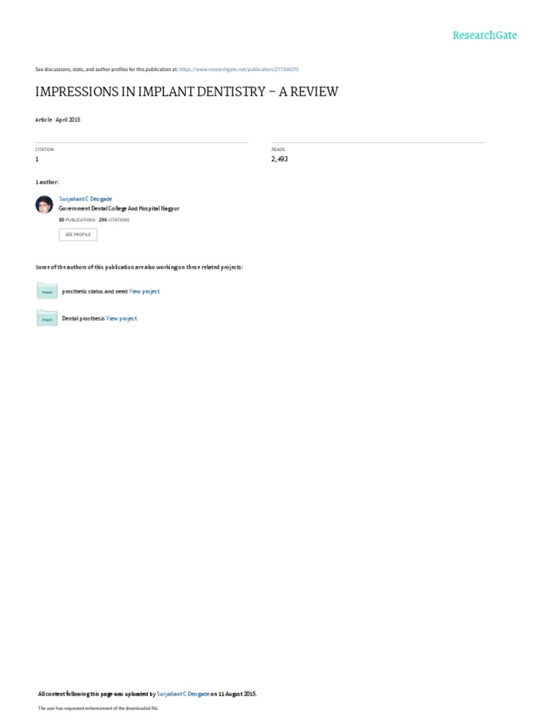 3. S Bhakta, J Vere, I Calder, RPatel. Impressions in Implant dentistry: Br Dent J 2011;211:361-367.