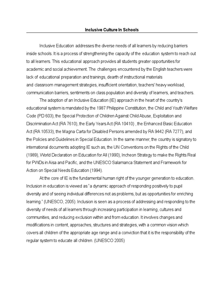 backgrounds and abilities. In inclusive schools, the establishment of such a climate