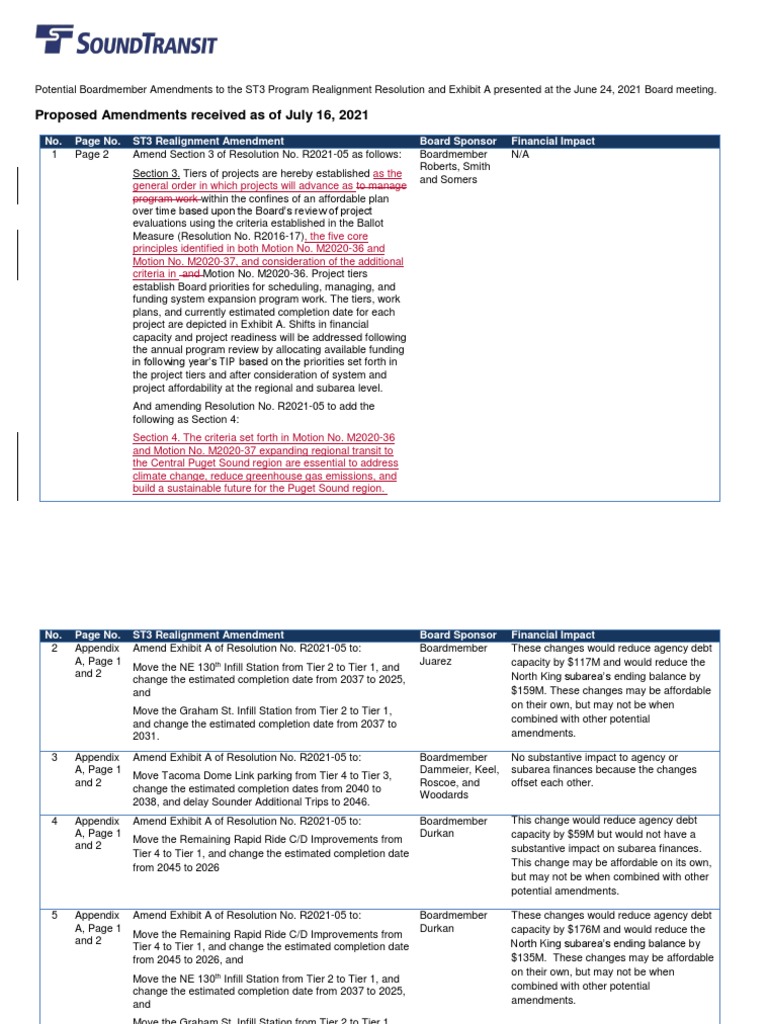 Potential Boardmember Amendments to the ST3 Program Realignment Resolution and Exhibit A presented at the June 24, 2021 Board meeting.