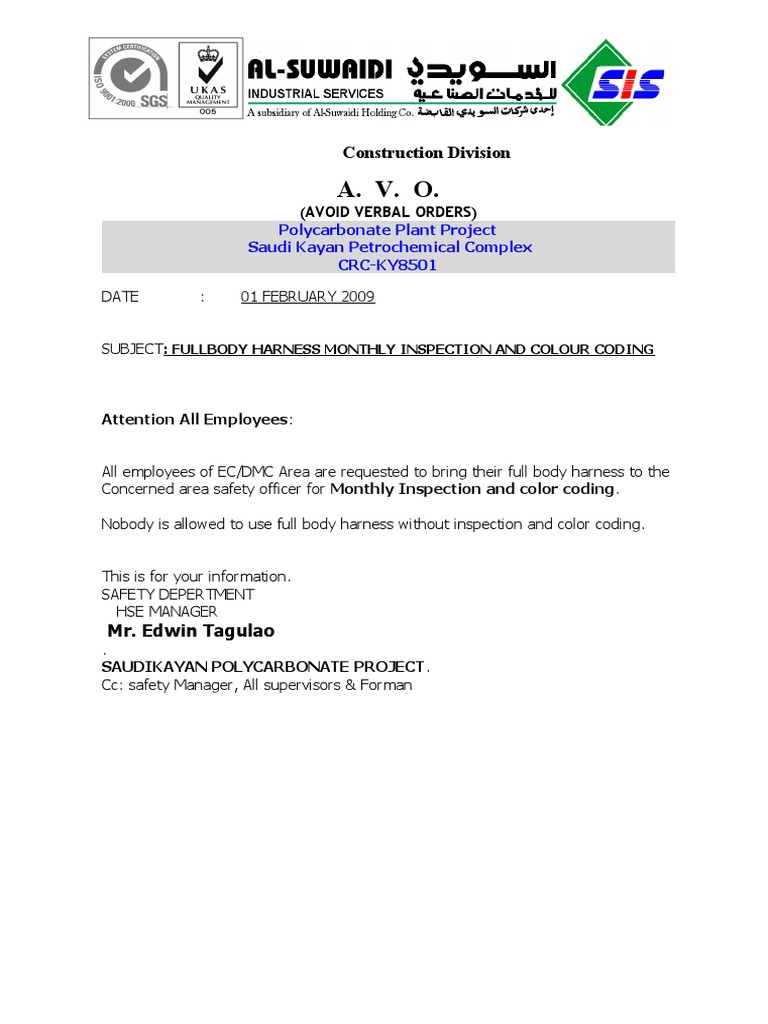 SUBJECT: FULLBODY HARNESS MONTHLY INSPECTION AND COLOUR CODING