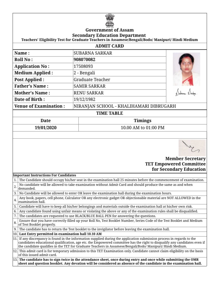 12. This admit card is for temporary admission to this TET Examination only. Candidate cannot claim eligibility on the basis