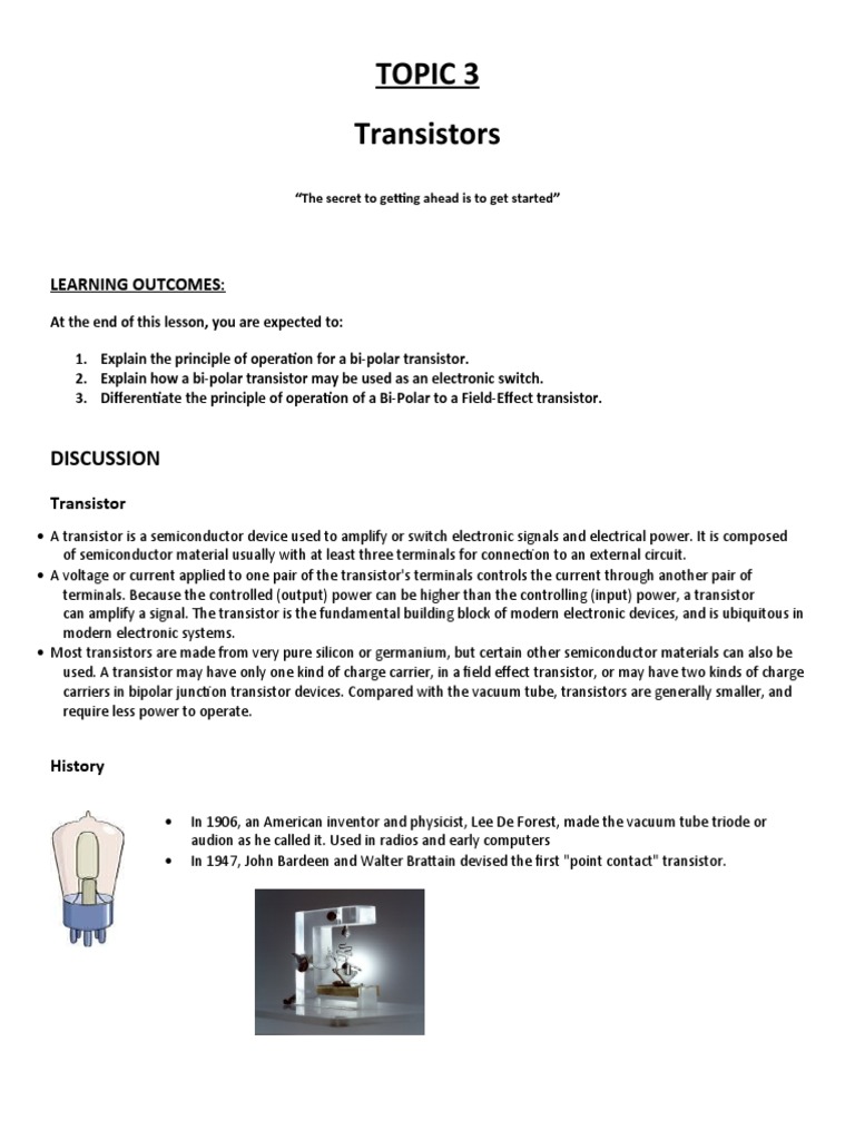 A transistor is a semiconductor device used to amplify or switch electronic signals and electrical power. It is composed