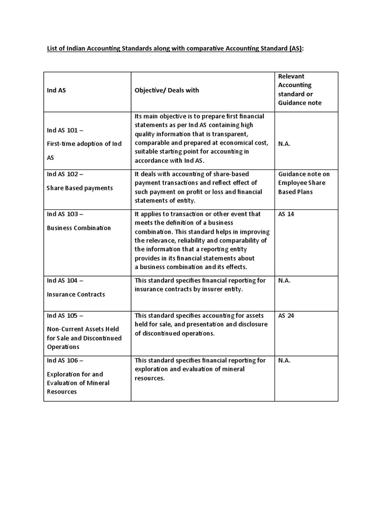 List of Indian Accounting Standards along with comparative Accounting Standard (AS):