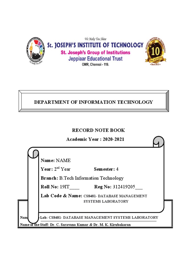 Lab Code & Name: CS8481- DATABASE MANAGEMENT