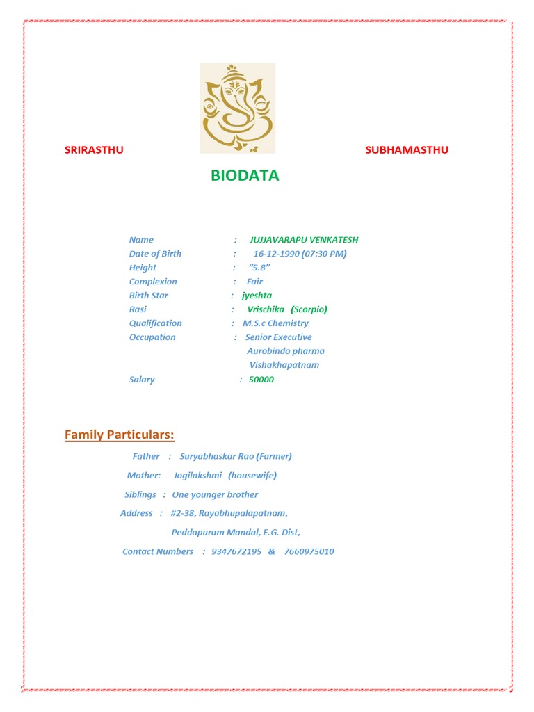Venkatesh was born on December 16, 1990 in Rayabhupalapalapatnam, India. He stands 5'8" tall, has fair complexion, and his birth star is Jyeshta and rasi is Vrischika. Venkatesh has an M.Sc in Chemistry and works as a Senior Executive at Aurobindo Pharma in Vishakhapatnam, earning a salary of 50,000 rupees. He comes from a family with his father Suryabhaskar Rao working as a farmer, his mother Jogilakshmi as a housewife, and one younger brother.