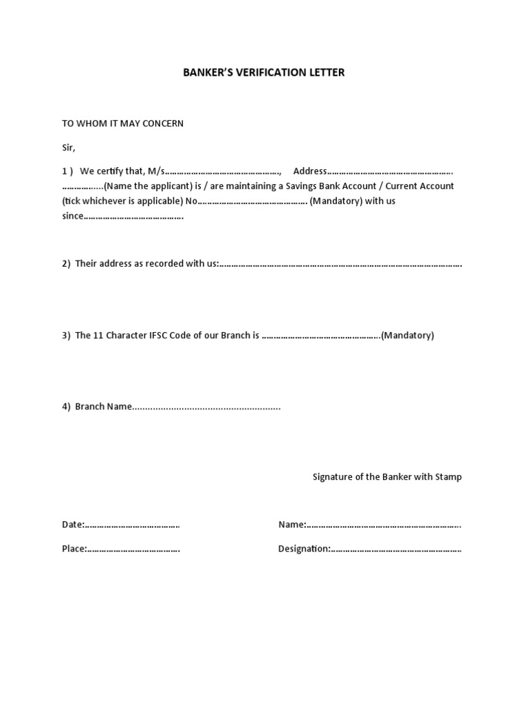 BANKER’S VERIFICATION LETTER