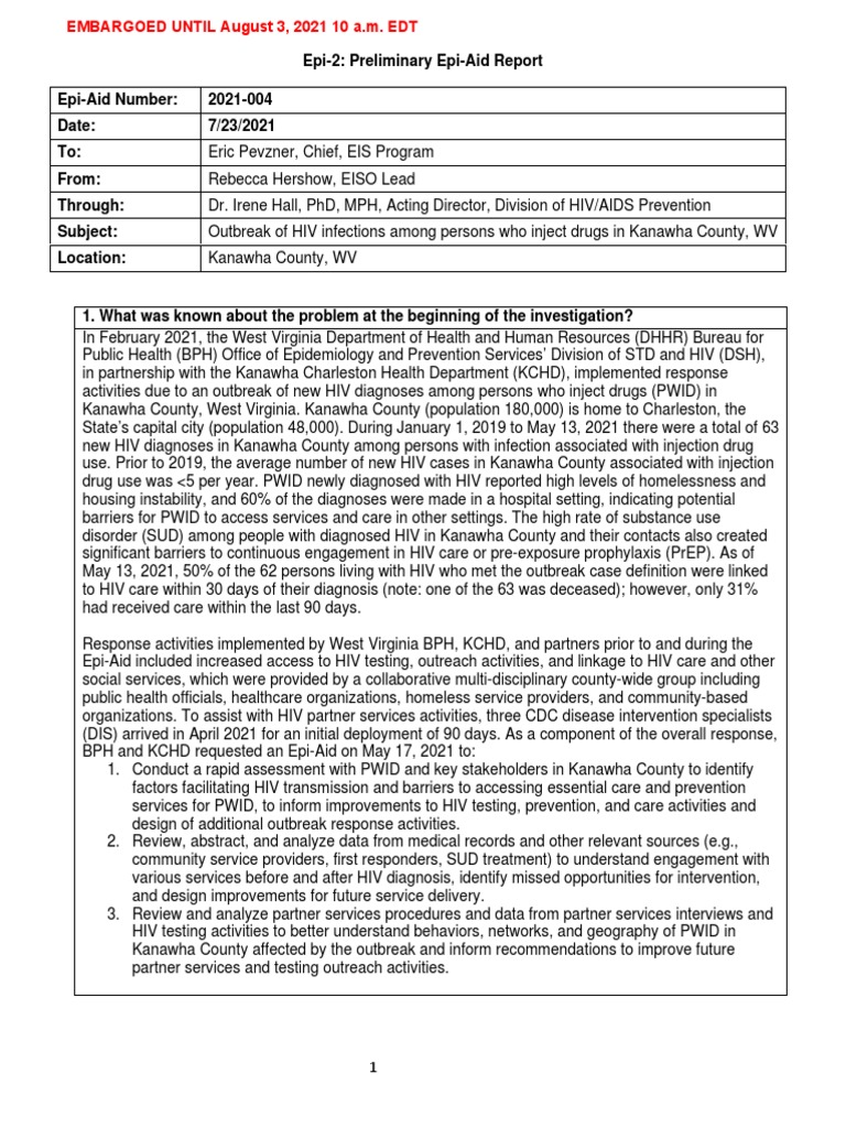 June 18, 2021, 2) residence in Kanawha County at HIV diagnosis, 3) history of injection drug