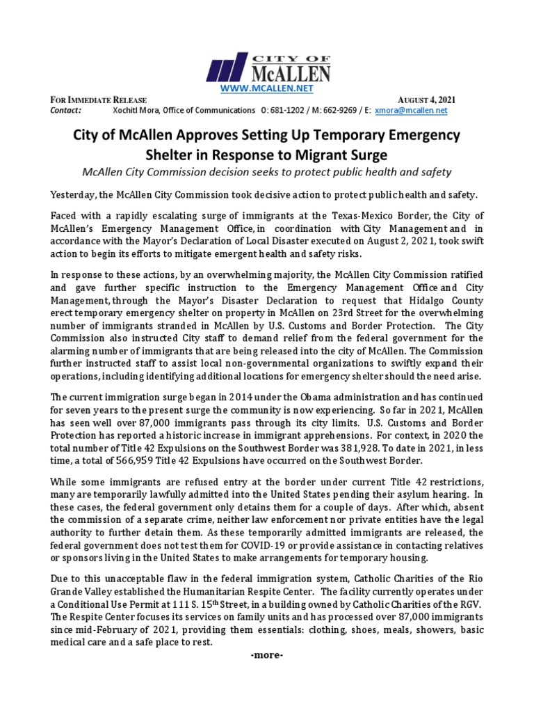 increase of immigrants arriving to McAllen, the City Commission’s first priority is to protect the health and safety of the residents they serve. Mayor Villalobos’s August 2, 2021