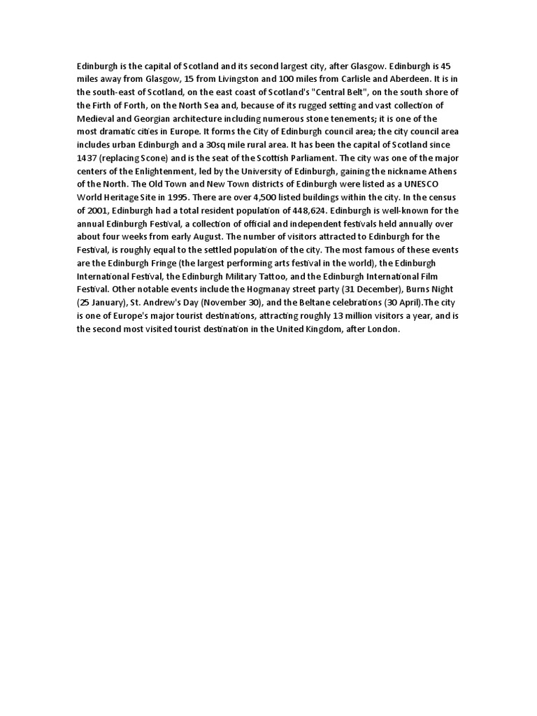 of 2001, Edinburgh had a total resident population of 448,624. Edinburgh is well-known for the