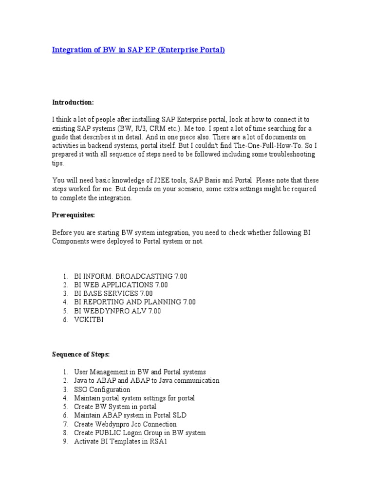 This document provides steps to integrate SAP Enterprise Portal (EP) with Business Warehouse (BW). It outlines prerequisites like required BI components. It then details the sequence of steps needed like: 1) User management in BW and EP, 2) Configuring Java to ABAP and ABAP to Java communication, 3) Single Sign-On setup, 4) Maintaining portal settings, 5) Creating the BW system in the portal, 6) Configuring the portal landscape directory, 7) Creating a Webdynpro JCo connection, 8) Setting up a public logon group in BW, 9) Activating BI templates, and 10) Troubleshooting. Configuration details are provided for each step.