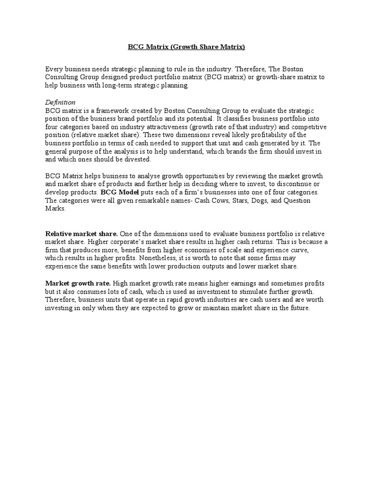 BCG matrix is a framework created by Boston Consulting Group to evaluate the strategic