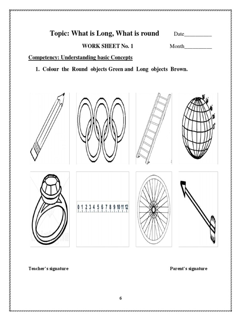 The document instructs students to color round objects green and long objects brown as part of a worksheet to understand basic concepts. It provides a topic, date, month, and space for teacher and parent signatures.