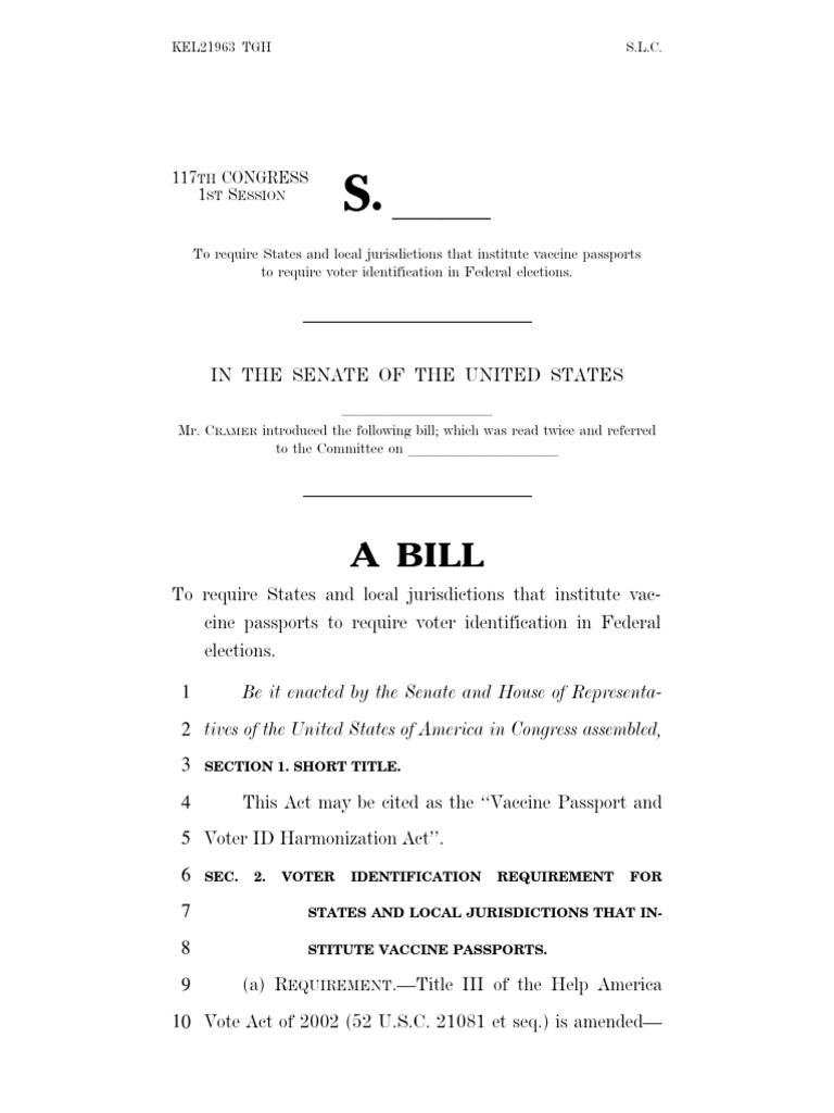 To require States and local jurisdictions that institute vac-cine passports to require voter identification in Federal elections.