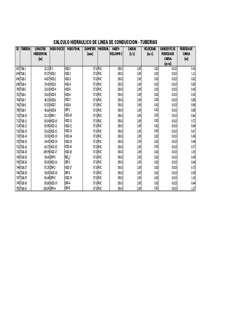 ID TUBERIA LONGITUD NODO INICIO NODO FINAL DIAMETRO MATERIAL HAZEN- CAUDAL VELOCIDAD GRADIENTE DE PERDIDA DE