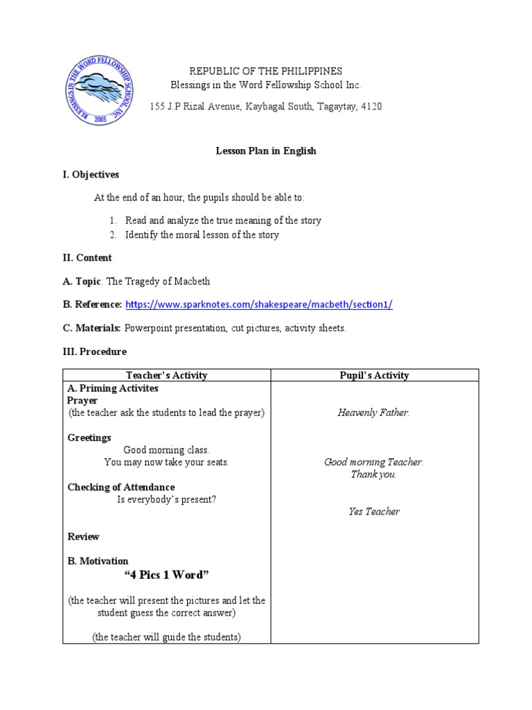 C. Materials: Powerpoint presentation, cut pictures, activity sheets.