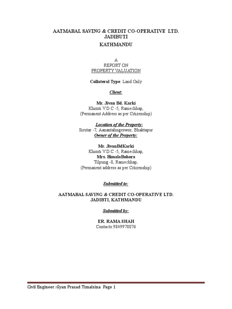 mortgage the land .Therefore, we have prepared the valuation report for the clientMr. Jivan Bdr.