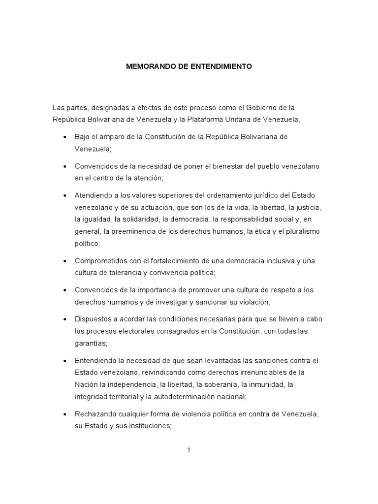Invitando a los miembros de la comunidad internacional a acompañarnos en estos propósitos, Hemos acordado llevar a cabo un proceso de diálogo y negociación integral e incremental basados en una agenda, formato y pautas, acordados por el Gobierno de la República Bolivariana de Venezuela y la Plataforma Unitaria de Venezuela de manera previa al inicio de las conversaciones en la Ciudad de México, capital de los Estados Unidos Mexicanos, cuya Agenda es la siguiente: