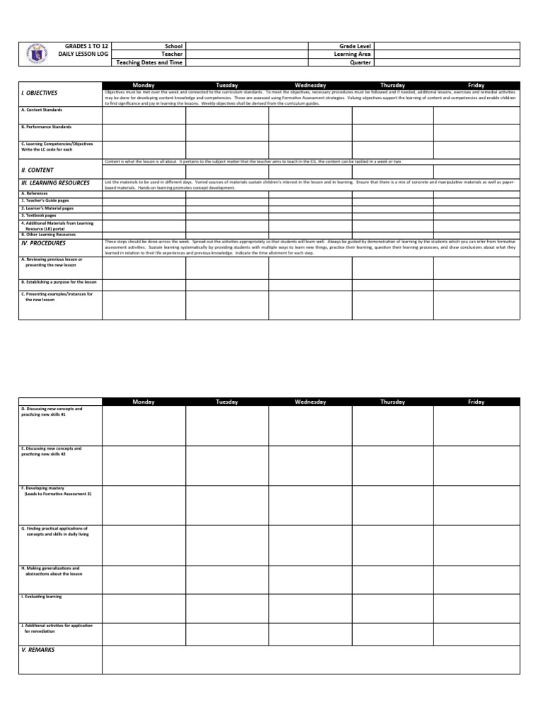 I. OBJECTIVES Objectives must be met over the week and connected to the curriculum standards. To meet the objectives, necessary procedures must be followed and if needed, additional lessons, exercises and remedial activities