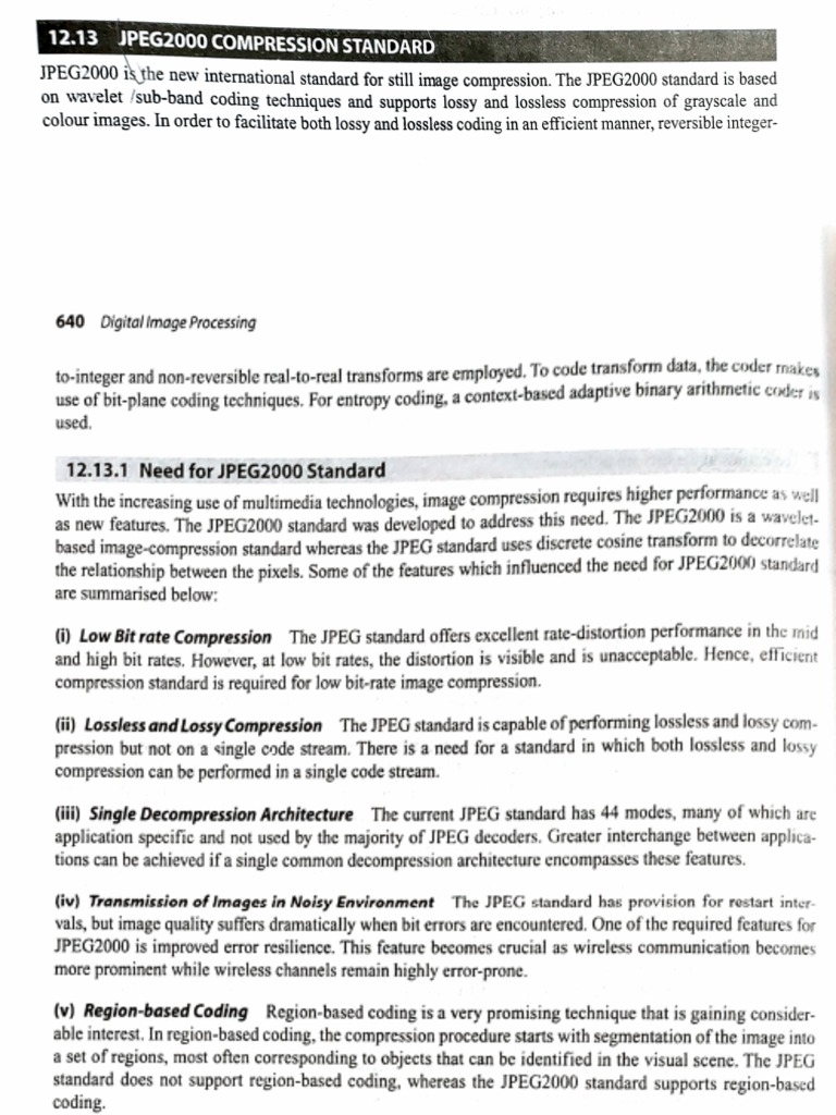 standard does not support region-based coding, whereas the JPEG2000 standard supports