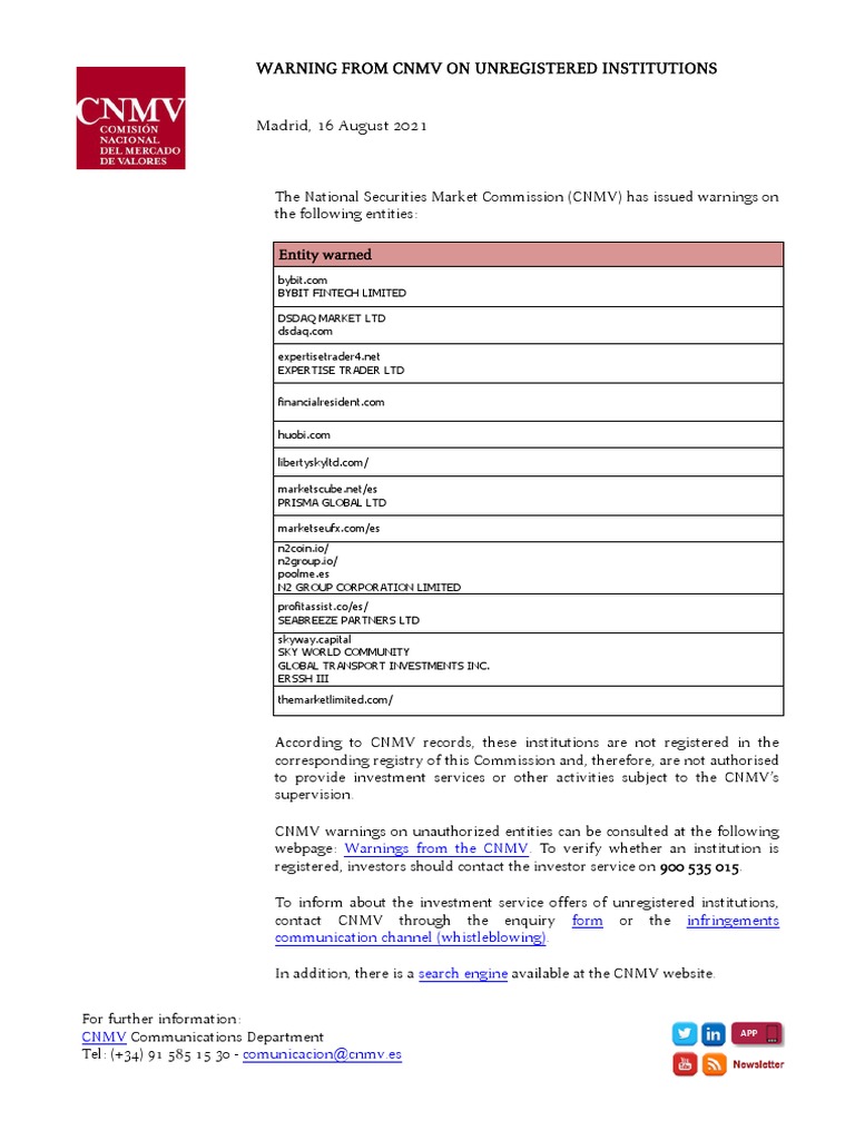 WARNING FROM CNMV ON UNREGISTERED INSTITUTIONS