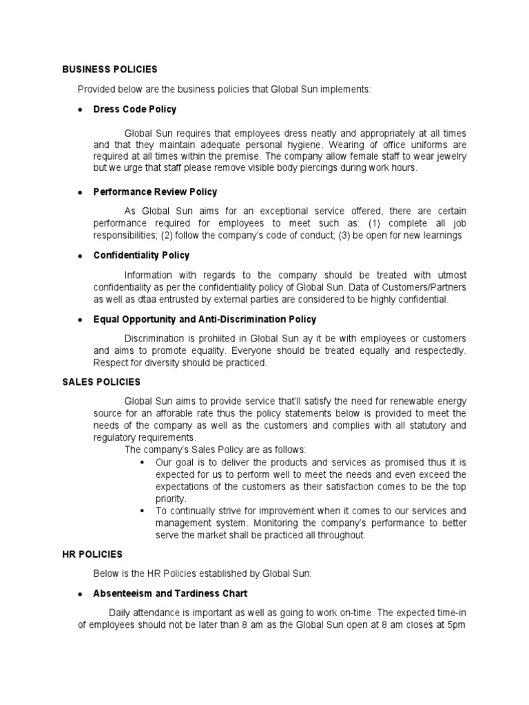 Provided below are the business policies that Global Sun implements: