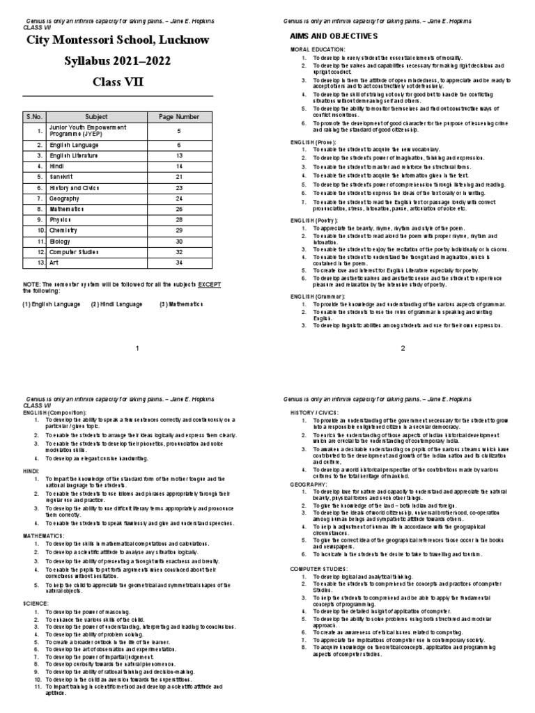 City Montessori School, Lucknow Syllabus 2021 2022 Class VII