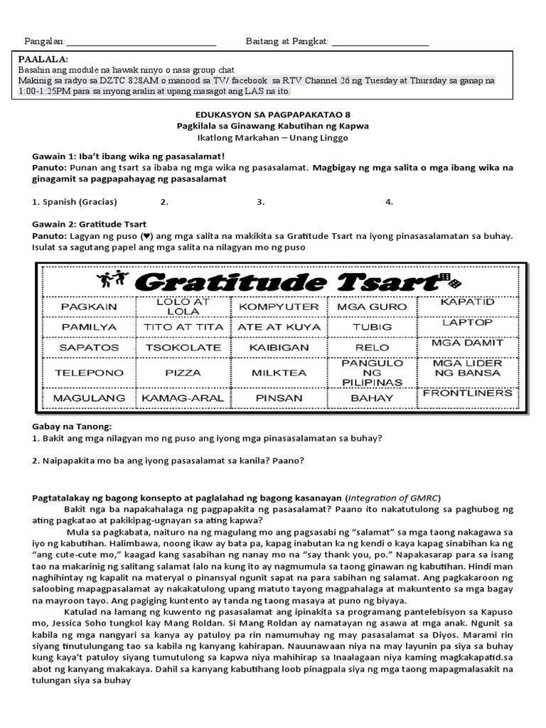 Panuto: Lagyan ng puso (♥) ang mga salita na makikita sa Gratitude Tsart na iyong pinasasalamatan sa buhay.