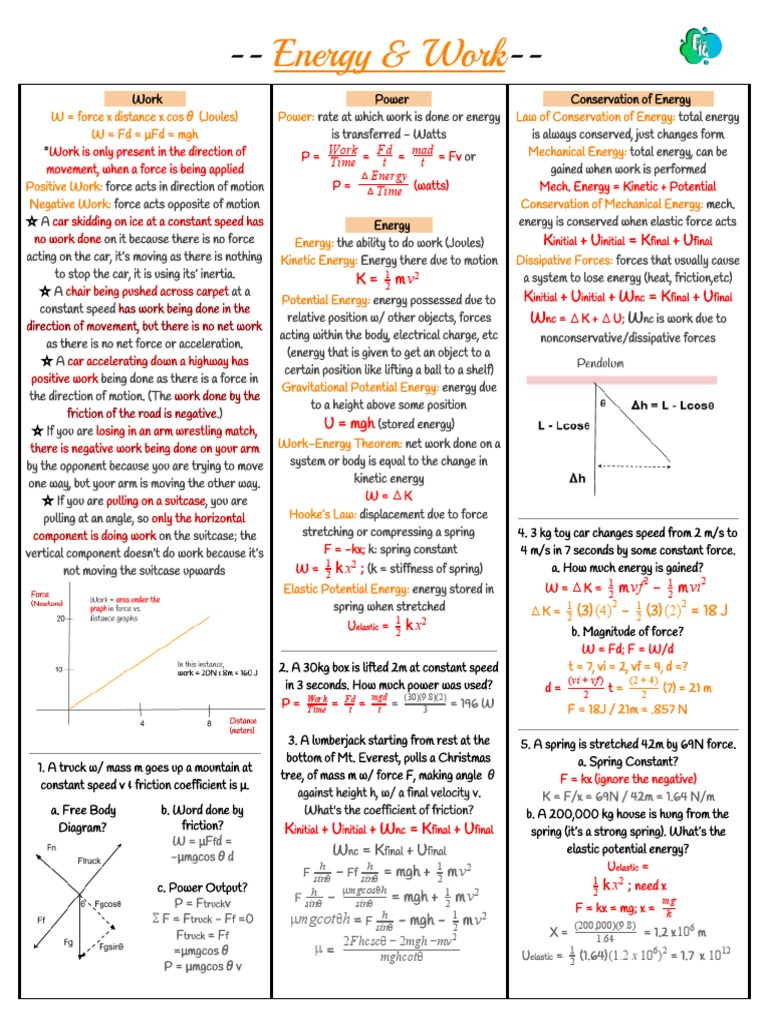 W = force x distance x cosθ (Joules) Power: rate at which work is done or energy Law of Conservation of Energy: total energy